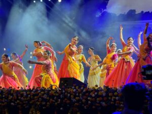 नृत्यगाथा की शुरुआत भीमबेटका की गुफाओं से हुई — जहां मानव सभ्यता की पहली झलक दिखाई देती है। इसके बाद मंच पर क्रमशः खजुराहो की मूर्तिकला, सांची के स्तूपों की शांति, चित्रकूट की भक्ति भूमि, उज्जैन और ओंकारेश्वर के ज्योतिर्लिंगों की दिव्यता, ग्वालियर किले की ऐतिहासिकता, मांडू की प्रेमकथा, और ओरछा के मंदिरों की भव्यता का अद्भुत संयोजन प्रस्तुत किया गया।