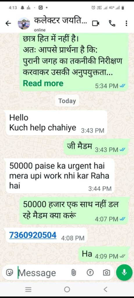 कलेक्टर कार्यालय से जुड़े कई लोगों के पास यह मैसेज पहुंचा। जनसंपर्क विभाग ने तुरंत सूचना जारी कर अलर्ट किया- ऐसे मैसेज पर किसी को पैसे न दें। यह मैसेज कलेक्टर द्वारा नहीं भेजे गए, बल्कि अनाधिकृत हैकर्स द्वारा किए गए हैं।