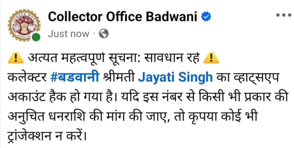 बड़वानी, 6 अप्रैल – बड़वानी जिले की कलेक्टर जयति सिंह का व्हाट्सऐप अकाउंट हैक हो गया। हैकर्स ने उनके नाम से कार्यालय के अधिकारियों-कर्मचारियों समेत अन्य जिलों के परिचितों को ’50 हजार की अर्जेंट आवश्यकता’ वाला मैसेज भेजा। मैसेज में यूपीआई में समस्या का हवाला देकर पैसे ट्रांसफर करने को कहा गया।