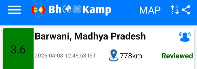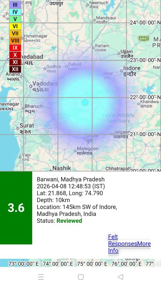 बड़वानी, 8 अप्रैल – बड़वानी जिले में भूकंप के झटके महसूस किए गए , बड़वानी अपर कलेक्टर सोहन कनास ने बताया कि जिले के कुछ हिस्सों से भूकंप के झटके महसूस होने की खबरें प्राप्त हुई प्राथमिक जानकारी के अनुसार दिन के 12 बजकर 48 मिनट पर रिएक्टर स्केल पर इसकी तीव्रता लगभग 3.6 नापी गई इसकी जानकारी इंदिरा सागर पावर स्टेशन की बड़वानी स्थित भूकंप वैधशाला से प्राप्त हुई इसमें में कंपन लगभग 2 मिनट तक रहा जो शुरू से आखिर तक कम होते हुए सामने आ रहा है जिले में कही भी जान माल के नुकसान होने की अब तक कोई खबर नहीं है इसके संबंध में और भी जानकारी संबंधित विभाग के वैज्ञानिकों से जुटाई जा रही जिसमें यह देखा जाएगा कि इसका केंद्र कहा है और यह कितनी गहराई तक का रहा है ।